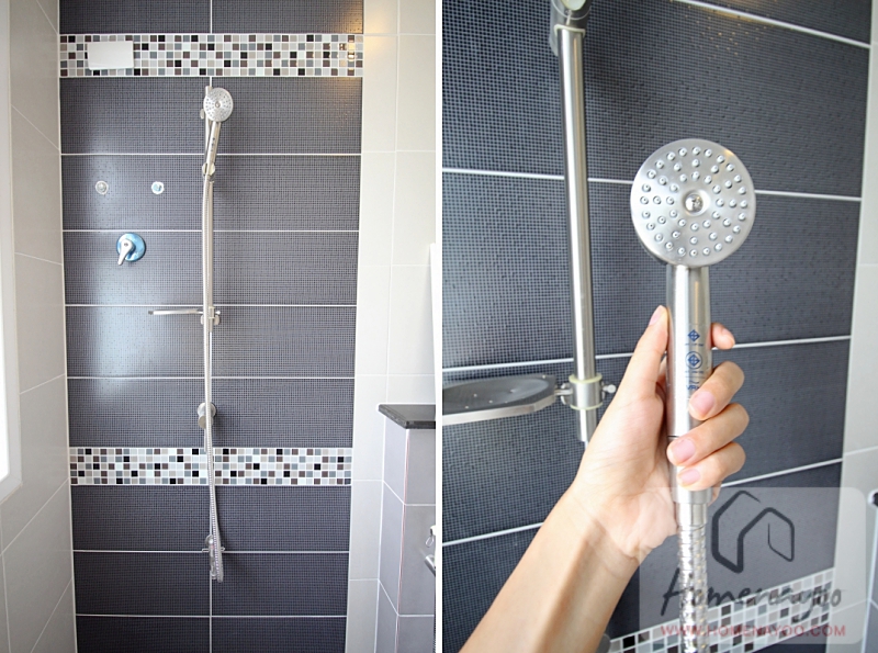 ที่ผนังมีเตรียมงานระบบสำหรับเครื่องทำน้ำอุ่นมาให้เรียบร้อย และมีที่วางสบู่ติดผนังมาให้ เทียบฝ่ามือดู ฝักบัวให้ขนาดมาใหญ่ดีและเป็นแบบเดียวกันกับห้องน้ำในห้องนอนห้องอื่นๆ