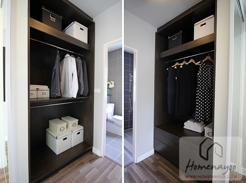 มาดูส่วน Walk in closet กันต่อค่ะ ห้องตัวอย่างจะมีทำ Built in ตู้เสื้อผ้ามาให้ดูเป็นไอเดียทั้งฝั่งซ้ายและขวา ให้เห็นระยะใช้งานสบายๆ