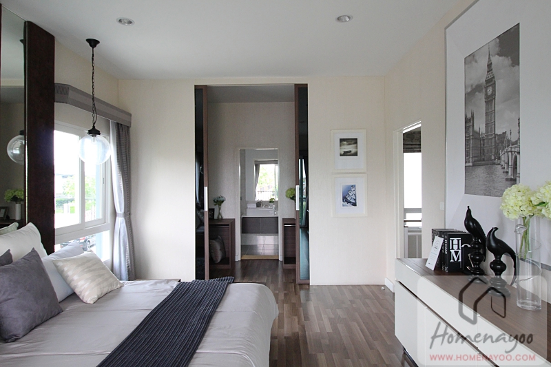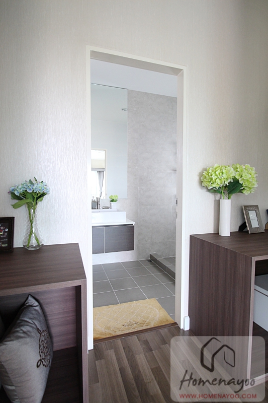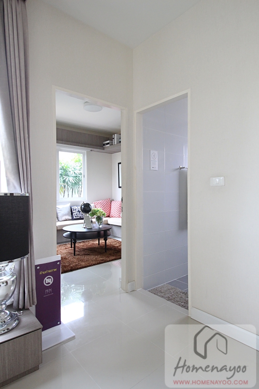 มองกลับไปที่ทางเข้าห้องนอน จะเห็นทางเดินไปห้องน้ำและส่วน Walk in closet ที่บ้านตัวอย่างทำเพิ่มมาให้ดูเป็นไอเดีย