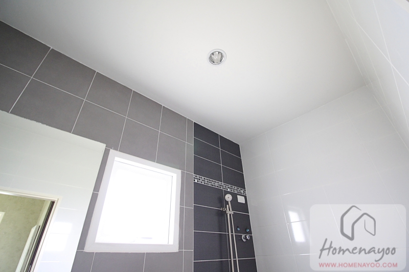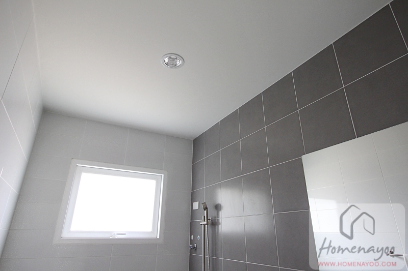 ผนังปูกระเบื้องมาให้จรดเพดาน มีหน้าต่างบานกระทุ้งคู่มาให้ 1 ชุดไว้ระบายอากาศ เพดานติดไฟดาวน์ไลท์