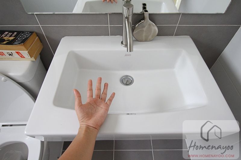 เทียบขนาดมือกับอ่างล้างมือให้ดูค่ะ ที่ขอบอ่างพอวางสบู่ล้างมือ แปรงสีฟันยาสีฟันได้ แต่ถ้าต้องการพื้นที่วางของเพิ่มแนะนำให้ต่อเคาน์เตอร์เพราะมีระยะใช้งานพอค่ะ