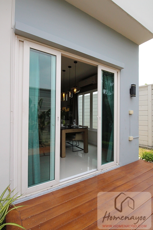 ที่ส่วนห้องรับประทานอาหารจะมีหน้าต่างบานสูงแบบบานเลื่อนคู่ กรอบอลูมิเนียมสีขาว ลูกฟักกระจะเขียวตัดแสง เป็นช่องแสงธรรมชาติขนาดใหญ่ซึ่งถ้าจัดสวนสวยๆ แสงดีๆ เปิดม่านก็จะได้บรรยากาศเหมือนทานข้าวในสวน ได้บรรยากาศไปอีกแบบ