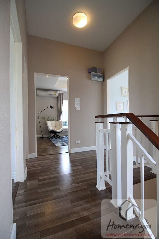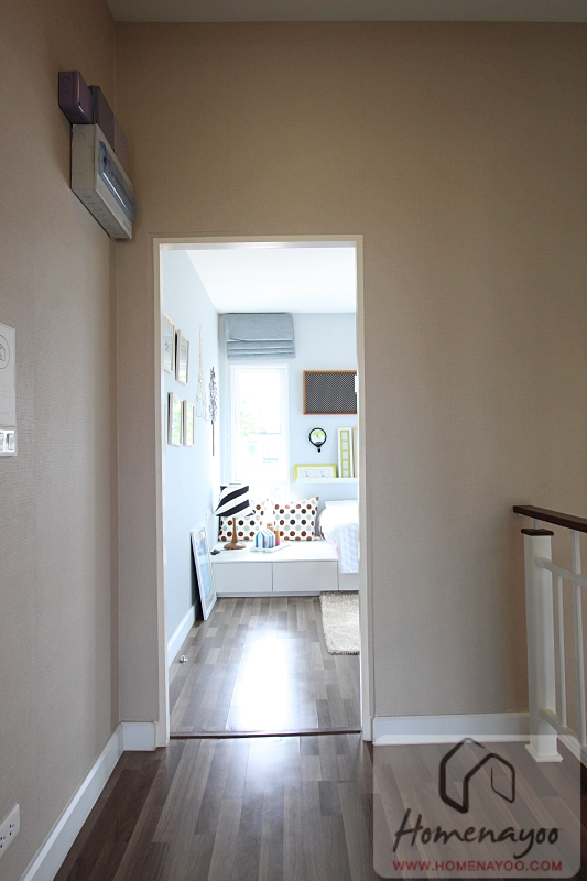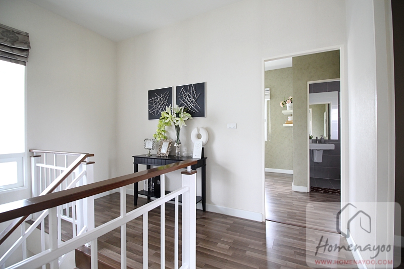 ส่วนพื้นชั้น 2 เป็นไม้ลามิเนตหนา 8 มม. โถงบันไดจะแจกไปที่ห้องนอนทั้งสามห้องและห้องน้ำรวมชั้น 2