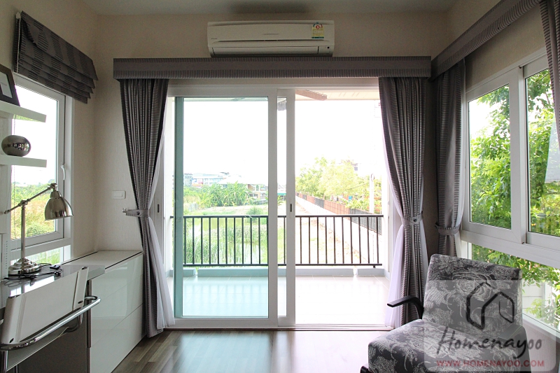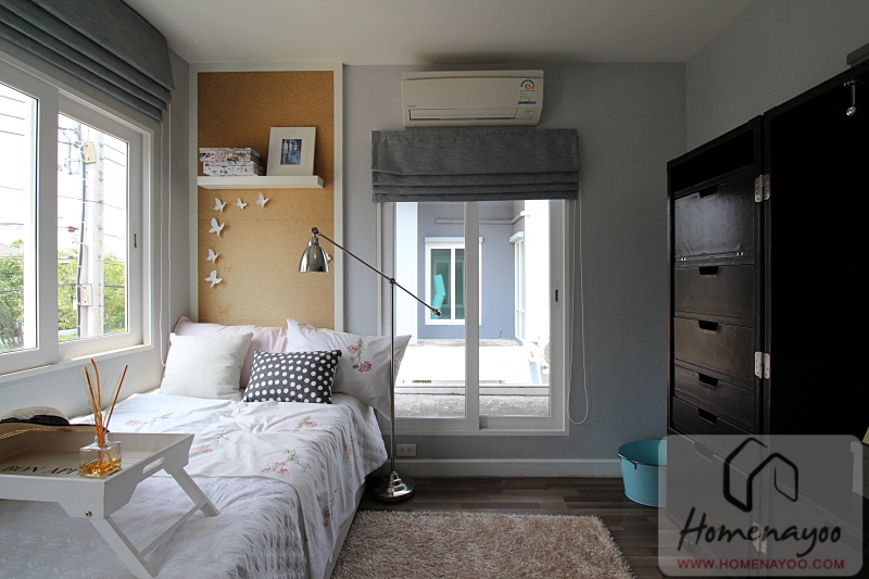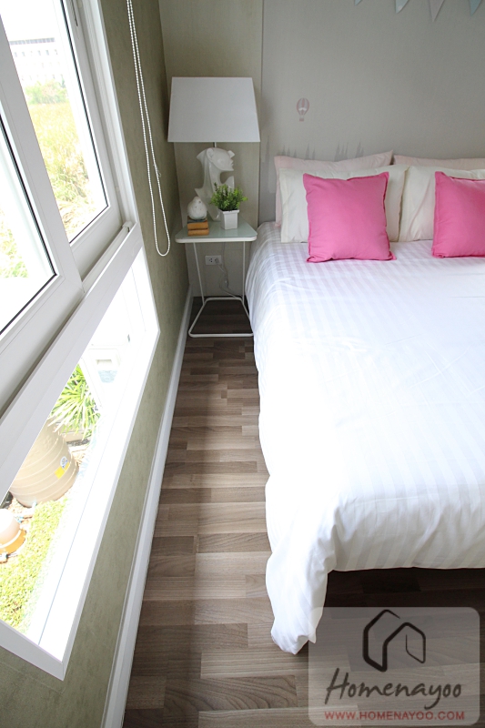 ห้องนอนเล็กห้องนี้สามารถวางเตียงคู่ 5 ฟุตชิดผนังฝั่งนึงได้อยู่ บ้านตัวอย่างวางเตียงเดี่ยวขนาด 3.5 ฟุตมาให้ดูระยะใช้งาน โดยที่ผนังห้องจะมีหน้าต่างบานเลื่อนคู่มาให้ฝั่งข้างเตียง 2 ชุด และหัวเตียง 1 ชุด