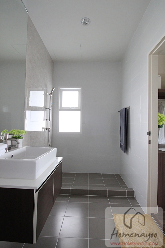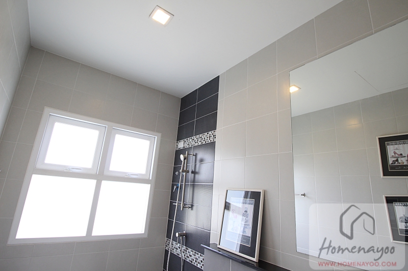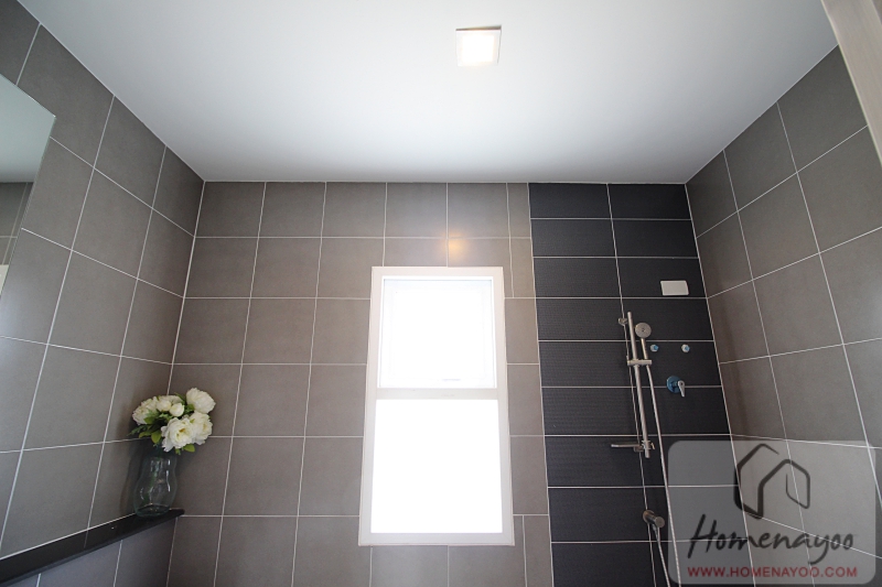 ส่วนอาบน้ำจะมีก่อธรณีกั้นแยกส่วนเปียกส่วนแห้งมาให้ ผนังปูกระเบื้องมาให้จรดเพดาน และมีหน้าต่างบานเลื่อนมาให้ 1 ชุดไว้ระบายอากาศ เพดานติดไฟดาวน์ไลท์