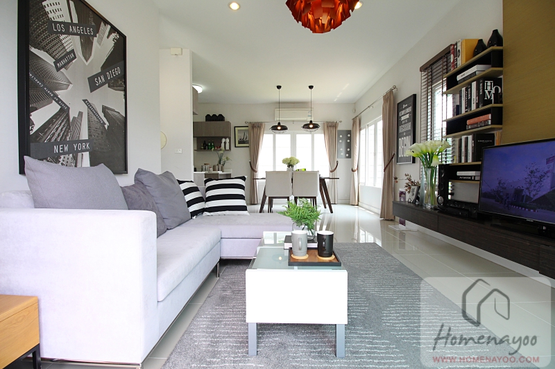 เปิดประตูเข้ามาด้านในจะเป็นส่วนห้องนั่งเล่นต่อเนื่องไปจนส่วนห้องทานอาหารค่ะ บ้านตัวอย่างจัดเฟอร์นิเจอร์มาให้เห็นความลงตัวในการใช้งาน ฝ้าเพดานเป็นยิปซั่มฉาบเรียบ เพดานค่อนข้างสูงที่ 2.75 ม. ใครชอบทำฝ้าเพดานซ่อนไฟ ซ่อนม่าน สั่งทำเฟอร์บิลด์อิน ก็สามารถทำได้เพราะมีความสูงเพดานกำลังดี