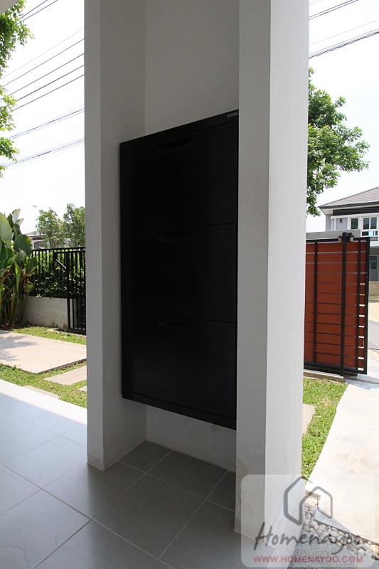 เฉลียงหน้าบ้านสูงจากพื้นดินขึ้นมา 1 ขั้น ขนาดกว้างพอเหมาะ พื้นเฉลียงปูกระเบื้องเซรามิก ขนาด 30 x 30 cm. และติดไฟดาวน์ไลท์มาให้ที่เพดานเรียบร้อย ประตูหน้าบ้านเป็นแบบบานเลื่อนกระจกเปิดได้สองฝั่ง กรอบประตูเป็นอลูมิเนียมสีขาว ลูกฟักกระจกเขียวตัดแสง