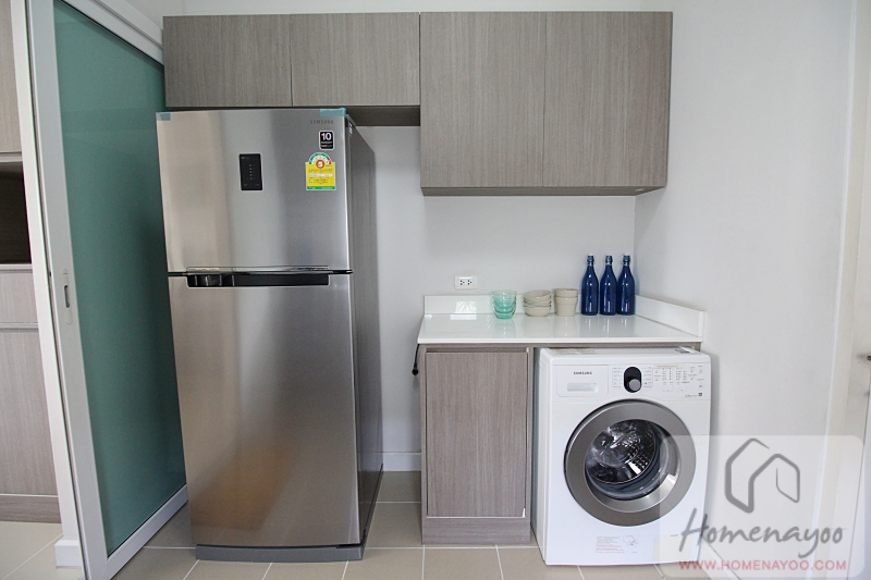 มองไปทางเคาน์เตอร์ครัวฝั่งซ้ายมือ วางตู้เย็นมาให้ดูระยะใช้งาน ที่ผนังเหนือเคาน์เตอร์จะเห็นว่าเตรียมเต้าเสียบปลั๊กไฟฟ้ามาให้เรียบร้อย และเตรียมงานระบบสำหรับเครื่องซักผ้าและอ่างล้างจานมาให้เรียบร้อย