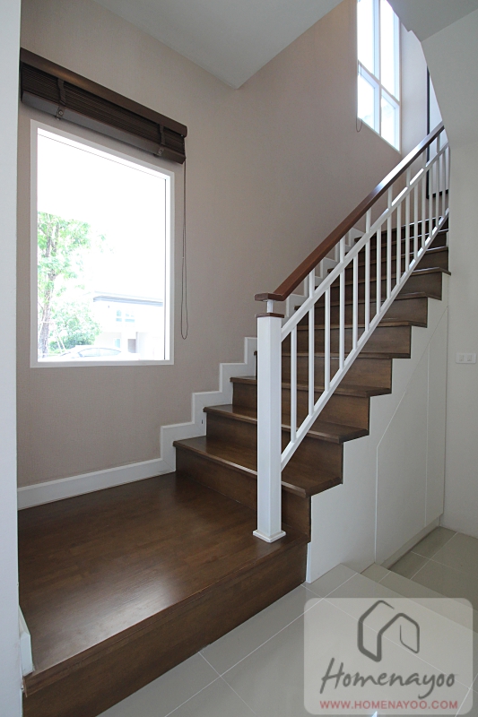ถัดจากห้องน้ำเป็นบันไดทางขึ้นไปชั้น 2 ลูกตั้งลูกนอนบันไดเป็นไม้ประสาน โครงสร้างเหล็ก พร้อมราวกันตกฝั่งขวามือเป็นเหล็กโปร่งสีขาวและมือจับเป็นไม้สีเข้ากันกับตัวบันได ชอบที่บันไดขั้นแรกเป็นชานพักบันไดให้นั่งใส่รองเท้าได้แบบนี้ค่ะ และมีหน้าต่างบานฟิกซ์เป็นช่องแสงธรรมชาติในตอนกลางวันให้โถงบันไดสว่างด้วย