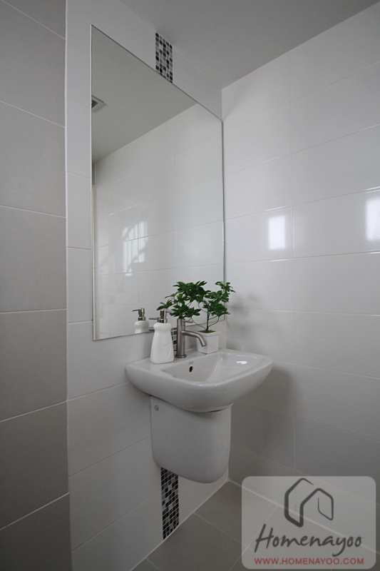 ห้องน้ำชั้นล่างของบ้านจะเป็นแบบ Powder Room ค่ะ สุขภัณฑ์เป็นของ American Standard พื้นห้องน้ำปูกระเบื้องเซรามิกขนาด 30 x 30 cm. โดยพื้นห้องน้ำลดระดับลงต่ำกว่าส่วนห้องนั่งเล่นประมาณ 5 เซนติเมตร หลังอ่างล้างมือและโถสุขภัณฑ์มี Low Wall ยาวเต็มความกว้างผนังมาให้ ได้พื้นที่วางของเพิ่มเยอะดีค่ะ