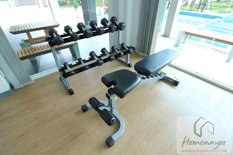 ห้องออกกำลังกายหรือห้องฟิตเนส วางเครื่องออกกำลังกายมาให้ 6 เครื่อง ติดเครื่องปรับอากาศไว้ข้างเพดาน