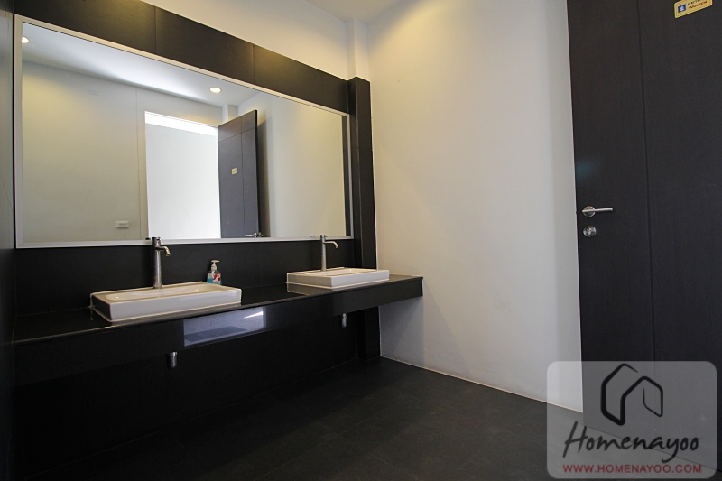 ภายในห้องน้ำมีอ่างล้างมือมาให้ 2 อ่าง วางมาบนเคาน์เตอร์หินแกรนิตสีดำ พร้อมกระจกเงาติดผนัง