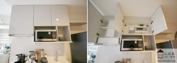 ด้านบนบิวท์อินตู้เก็บของใช้ ซ่อนกล่องควบคุมไฟฟ้าไว้ภายในตู้ มีช่องสำหรับวางไมโครเวฟ