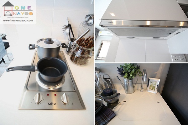 TOP ครัว ได้เครื่องใช้ไฟฟ้าครบชุด โดยจะได้เตาไฟฟ้า 2 หัว + เครื่องดูดควัน และซิงค์ล้างจานสแตนเลสแบบมีบานปิด ของ MEX ค่ะ