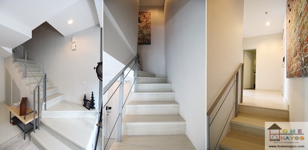 ขึ้นไปดูกันต่อที่ชั้นสองค่ะ บันไดคอนกรีตเสริมเหล็ก หน้าไม้ลามิเนตหนา 8 มม. ราวบันไดเหล็กแบนทาสีเทา