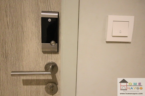 ประตูห้องไม้สีอ่อน มือจับสแตนเลสแบบก้านโยก + Digital Door Lock ของ Yale พร้อมกริ่งหน้าห้องของ Bell ค่ะ