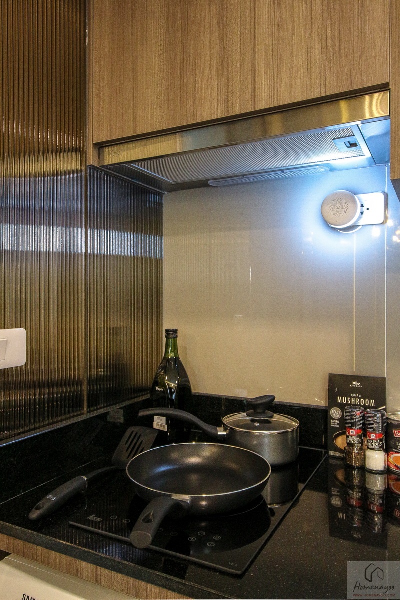 มองกลับมาที่ประตูทางเข้าห้องพัก จะเจอกับมุมครัวเปิด ได้ชุดครัวมาตรฐานเหมือนกันกับห้องก่อนหน้านี้