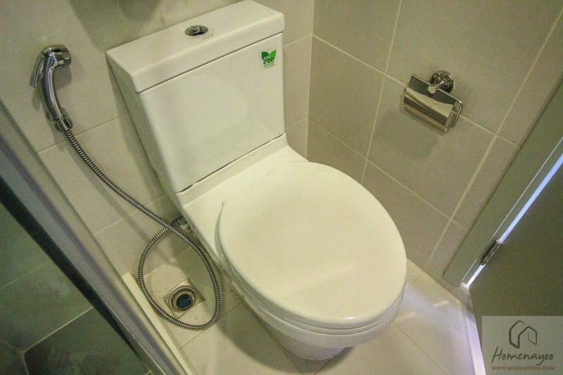 ธรณีประตูได้เป็นหินแกรนิตสีขาว ข้อดีคือไม่บวมน้ำเมื่อใช้งานไปนาน ๆ พื้นที่ใช้งานด้านในขนาดพอเหมาะกับห้องที่มีพื้นที่จำกัด ปูพื้นและผนังด้วยกระเบื้องเซรามิกโทนสีเทา 30 x 30 ซม.