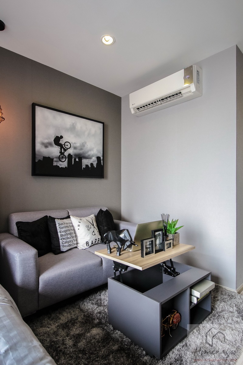 ไปต่อกันที่ส่วนพักผ่อนด้านใน ห้องจริงได้เฟอร์นิเจอร์พร้อมอยู่ครบชุด แต่หน้าตาของเฟอร์นิเจอร์จะได้ตามแบบมาตรฐานของโครงการนะคะ