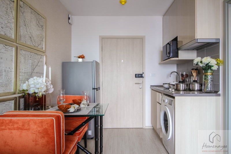 ตรงข้ามชุดครัวมีพื้นที่เหลือให้วางตู้เย็น ขนาด 6-10 คิวได้ ติดกันเป็นมุมทานอาหาร ขนาด 2 ที่นั่ง