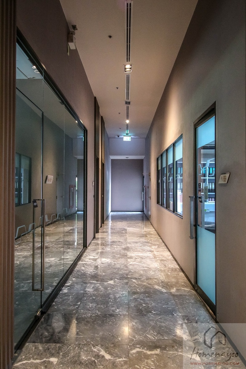 เปิดประตูห้องพักเข้ามาจะเจอกับมุมครัวเปิด และมุมทานอาหารเป็นส่วนแรก มองต่อเนื่องไปเป็นมุมนั่งเล่น และระเบียงแบบ 2 ชั้น ที่ด้านนอกสุด ความสูงพื้น-เพดาน 2.5 เมตร เท่ากันทั้งโครงการ พื้นห้องชุดปูลามิเนตลายไม้สีอ่อน หนา 8 มม. ผนังและฝ้าเพดานในห้องมาตรฐานแบบฉาบเรียบทาสีขาว ส่วนไฟในห้องเป็นแบบดาวน์ไลท์ทั้งหมดเช่นเดิมค่ะ