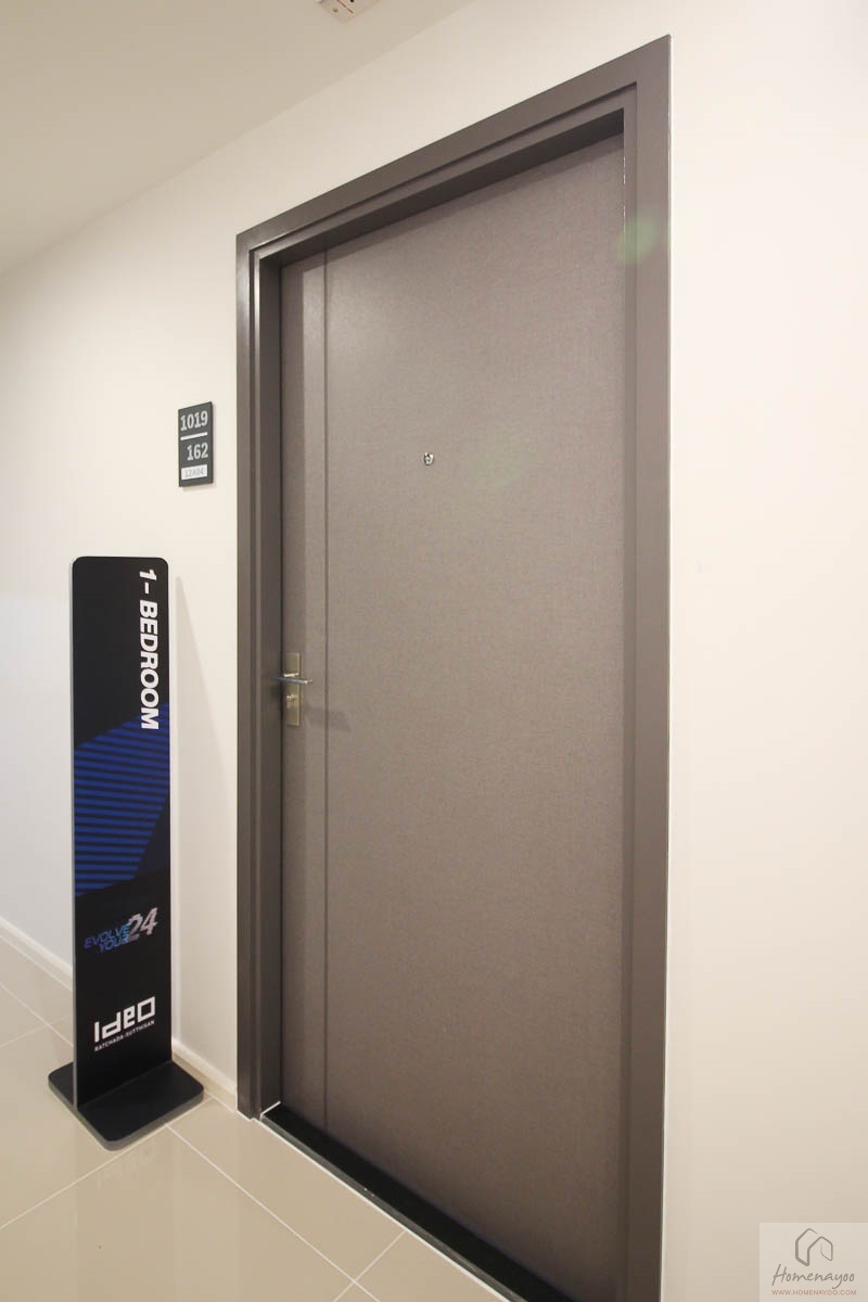 มาถึงหน้าห้องตัวอย่างกันแล้ว ประตูใช้บานสำเร็จรูป ติดมือจับประตูก้านโยกสแตนเลส