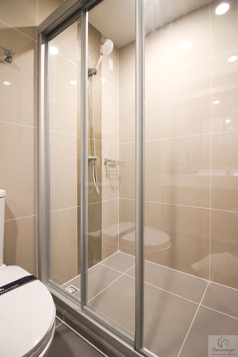 ตรงโซนอาบน้ำติดตั้งฉากกั้นอาบน้ำของ Charmer มาให้เรียบร้อย เป็นประตูบานสไลด์ 3 ตอน พื้นที่ยืนอาบน้ำข้างในปูด้วยกระเบื้องแบบเดียวกัน