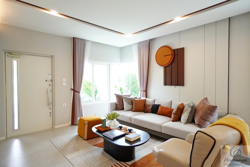 ห้องนั่งเล่นรองรับโซฟาชุดใหญ่ 4-6 ที่นั่ง พร้อมโต๊ะกาแฟตรงกลางได้สบาย ๆ
