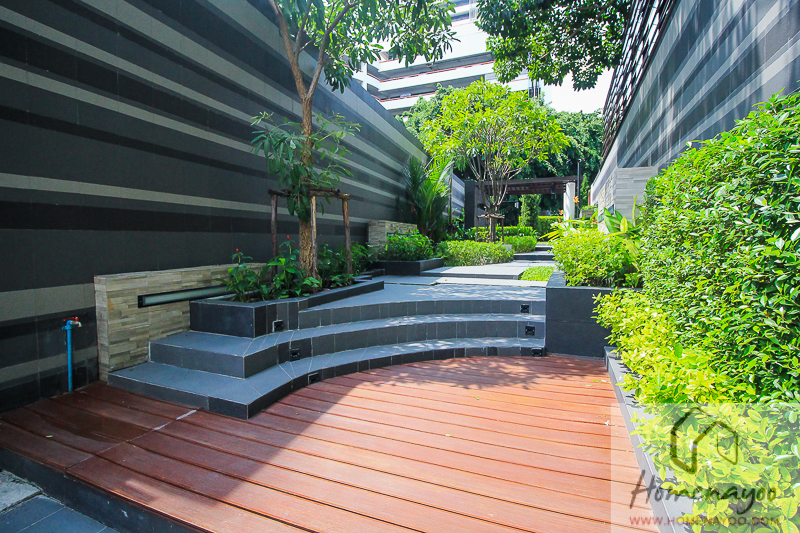 การออกแบบโครงการและวัสดุ : โครงการนี้เป็นคอนโด Low Rise สูง 8 ชั้น + ชั้นจอดรถใต้ดิน 2 ชั้น จำนวนห้องพัก 143 ยูนิต บนที่ดินประมาณ 1 ไร่เศษ การออกแบบมาในสไตล์รีสอร์ท บรรยากาศสบายๆ เน้นการตกแต่งด้วยพื้นที่สีเขียวและไม้เป็นหลัก และให้ส่วนกลางมาแบบจัดเต็มพอสมควร