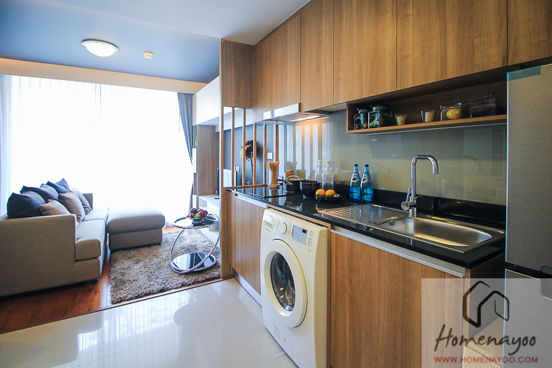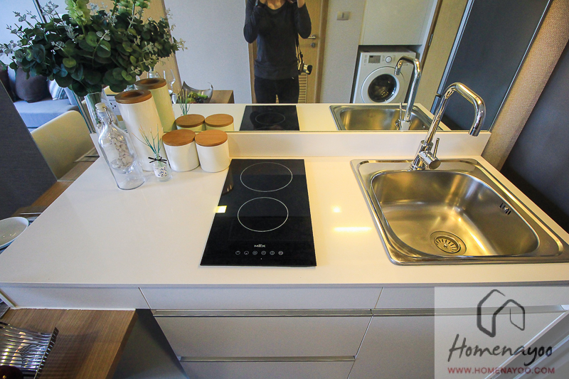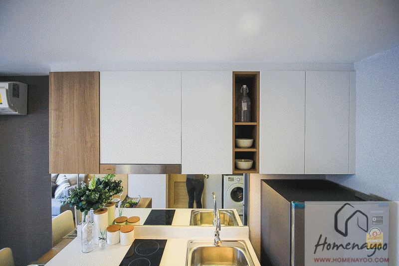 พื้นที่การใช้งานเคาน์เตอร์ครัวจะกว้างกว่าห้องแบบที่แล้วพอสมควร มีพื้นที่เตรียมอาหารและพื้นที่เก็บของเพิ่มขึ้น