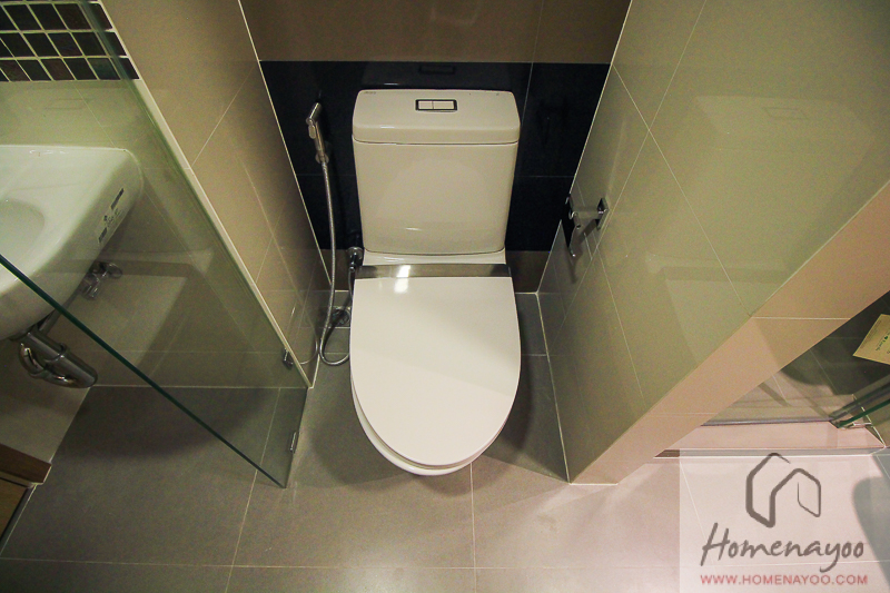 ภายในห้องน้ำตกแต่งด้วยโทนสีเทา พร้อมสุขภัณฑ์ครบชุด ซึ่งห้องน้ำห้องนี้จะใช้เป็นทั้งส่วนรับแขกและห้องน้ำสำหรับห้องนอนรองค่ะ