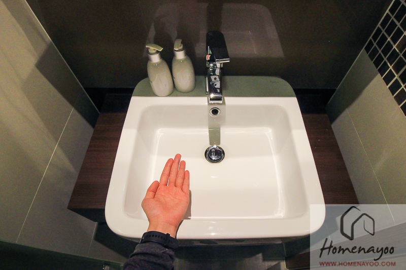 อ่างล้างมือได้แบบฝังเคาน์เตอร์ ข้างกันเป็นโถสุขภัณฑ์ มีระยะการใช้งานพอดีๆ