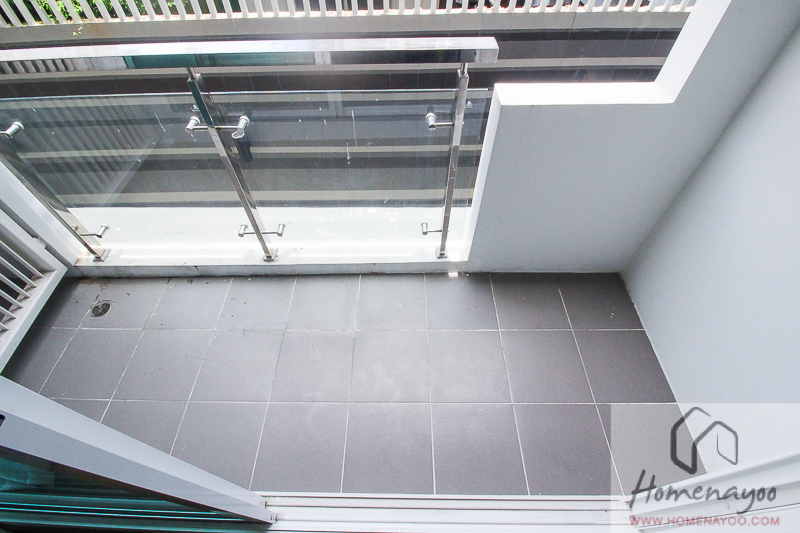 พืนที่ริมฝั่งนึงของระเบียง จะเป็นที่วางคอมเพรสเซอร์แอร์ มีกริลบังสายตาจากภายนอกเป็นระเบียบดี และอีกด้านมีโคมไฟภายนอกติดมาให้ 1 ดวง