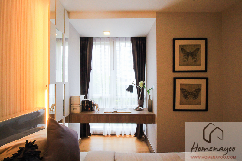 พื้นที่ข้างเตียงอีกฝั่งมีชุดโต๊ะทำงานริมหน้าต่างติดตั้งมาให้