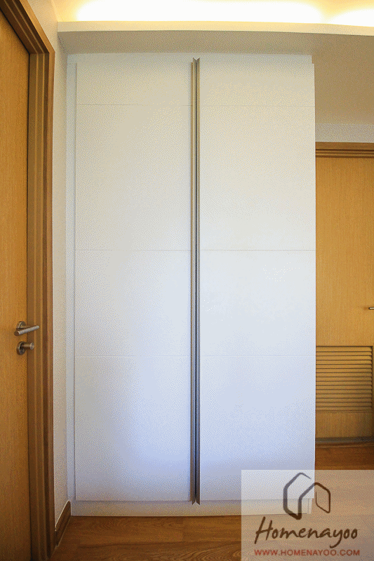 ตู้เสื้อผ้าจะได้เป็นบานเปิด ด้านในแบ่งเป็นราวแขวน ช่องเก็บของย่อยด้านล่าง และช่องเก็บของด้านบน
