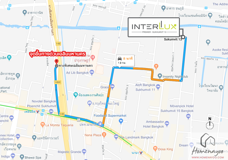 การเดินทางในวันนี้ เราจะเริ่มต้นกันบนถนนพระราม 1 ฝั่งมุ่งหน้าถนนสุขุมวิท ขับตรงไปจนถึงแยกตัดถนนวิทยุแล้วเลี้ยวซ้าย(เส้นทางบังคับเลี้ยว) เข้าถนนวิทยุ ขับตรงไปจนเชื่อมถนนเพชรบุรี แล้วเลี้ยวขวาขับตรงไปเรื่อยๆจนถึงซอยสุขุมวิท 3 หรือซอยนานาเหนือแล้วเลี้ยวขวาเข้าซอยเพื่อขับลัดตรงไปจนถึงถนนสุขุมวิท แล้วเลี้ยวซ้ายเข้าซอยสุขุมวิท 13 ขับตรงไปจนสุดซอย ประมาณ 950 เมตร จะถึงโครงการ Inter Lux Premier สุขุมวิท 13 ทางซ้ายมือ