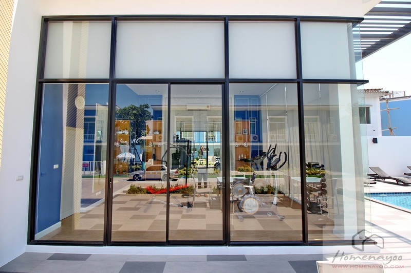 ห้องฟิตเนส อยู่ด้านในอาคาร รอบด้านเป็นกระจกทรงสูงโปร่งสบาย
