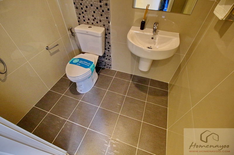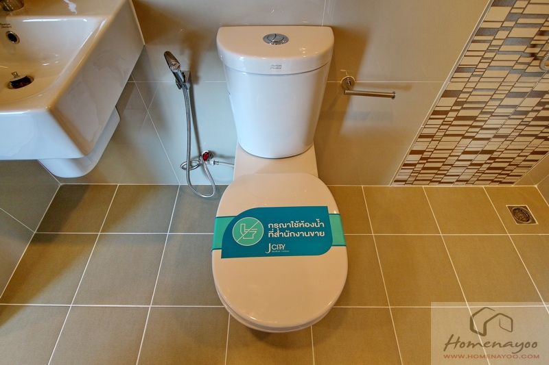 ภาพรวมภายในห้องน้ำ มีการแบ่งพื้นที่เป็นโซนแห้ง-เปียกได้ดีขึ้น แต่ไม่ได้ก่อขอบธรณีกันน้ำไหลให้สำหรับส่วนเปียก พื้นปูด้วยกระเบื้องเซรามิค ผนังปูด้วยแกรนิตโต้