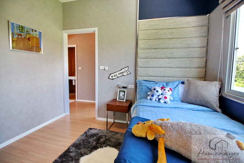 ห้องนอนรองห้องนี้ ถือว่ามีพื้นที่ขนาดกว้างทีเดียว โดยสังเกตจากพื้นที่ใช้งานตรงกลางห้องที่เหลือ หลักจากที่จัดวางเฟอร์นิเจอร์แล้วยังคงดูโล่งเดินผ่านเข้าออกได้อย่างสะดวก สำหรับเพดานห้องนอนรองสูง 2.7 เมตร