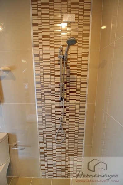 ผนังด้านหลังฝักบัวมีการปูกระเบื้องเล่นลายโมเสค รูปแบบฝักบัวแขวนบนราวที่สามารถปรับระดับได้ มีที่วางสบู่ในตัว แต่ในการใช้งานจริงยังคงไม่เพียงพอ ต้องหาชั้นวางมาเพิ่มเติม