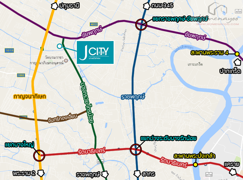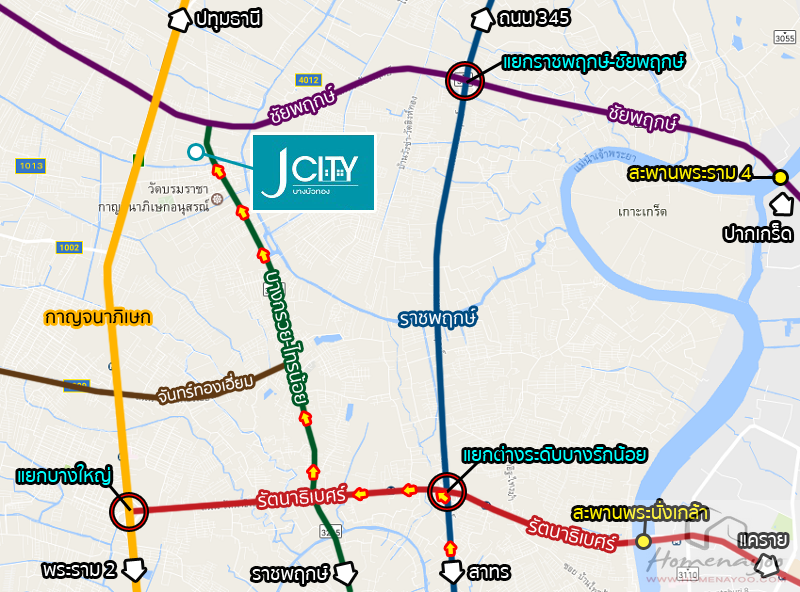 – ทำเลที่ตั้งโครงการ : J City รัตนาธิเบศร์ – ราชพฤกษ์ ตั้งอยู่บนถนนบางกรวย-ไทรน้อย ช่วงที่ใกล้กับทางออกถนนชัยพฤกษ์ หรือหากจะพูดให้เข้าใจง่ายๆคือทำเลที่อยู่ใกล้ตลาดบางบัวทอง และวัดเล่งเน่ยยี่ 2 นั่นเอง โครงสร้างสองฝั่งของถนนบางกรวย-ไทรน้อย ส่วนใหญ่เป็นบ้านพักอาศัยในรูปแบบของชุมชนดั้งเดิมและหมู่บ้านจัดสรร ด้วยความที่ถนนบางกรวย-ไทรน้อยเอง ไม่ใช่ถนนเส้นหลักอย่างถนนกาญจนาภิเษกหรือถนนราชพฤกษ์ จึงทำให้โดยปกติแล้วเรื่องของรถติดจึงไม่ค่อยน่ากังวลนัก เว้นแต่หากว่าเป็นช่วงวันหยุดปริมาณจะมีรถสัญจรผ่านมากหน่อยเพราะมี วัดเล่งเน่ยยี่ 2 ที่มีผู้คนจำนวนมากหลั่งไหลกันเข้ามากราบไหว้ สักการะขอพร เสริมสิริมงคลรวมถึงแก้ปีชง