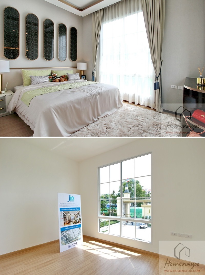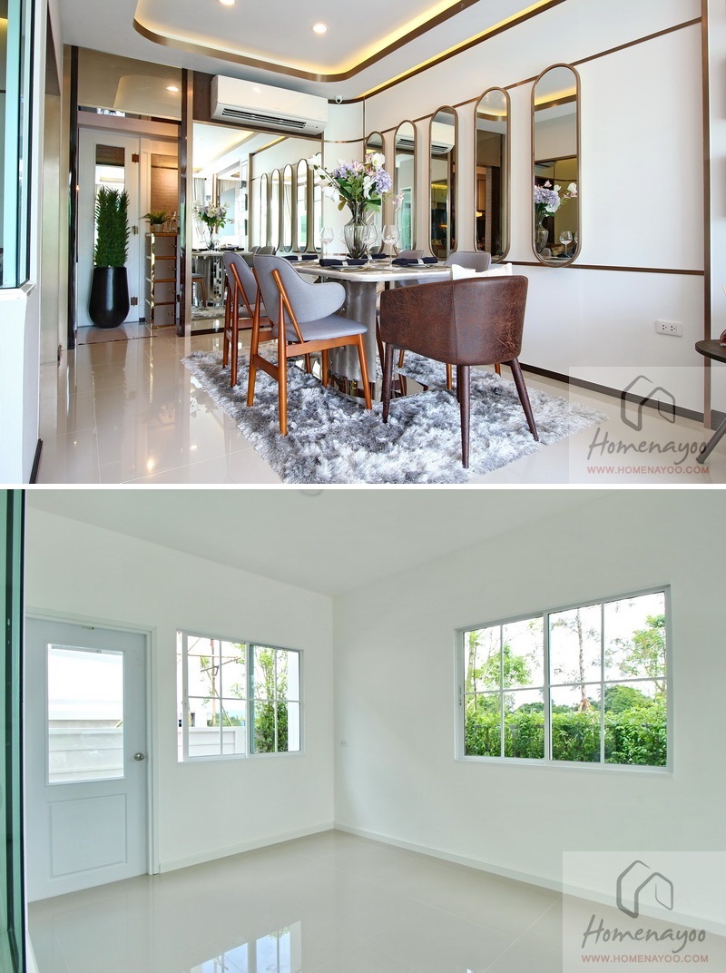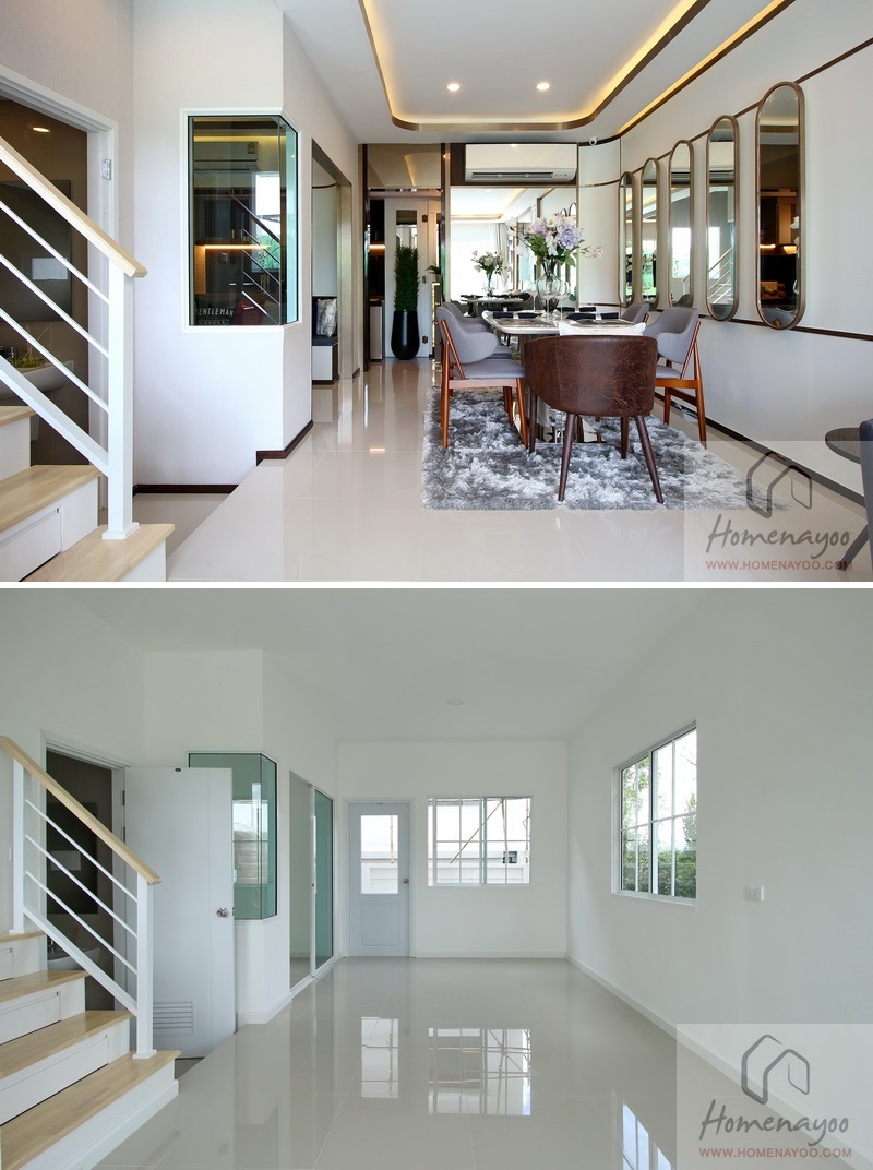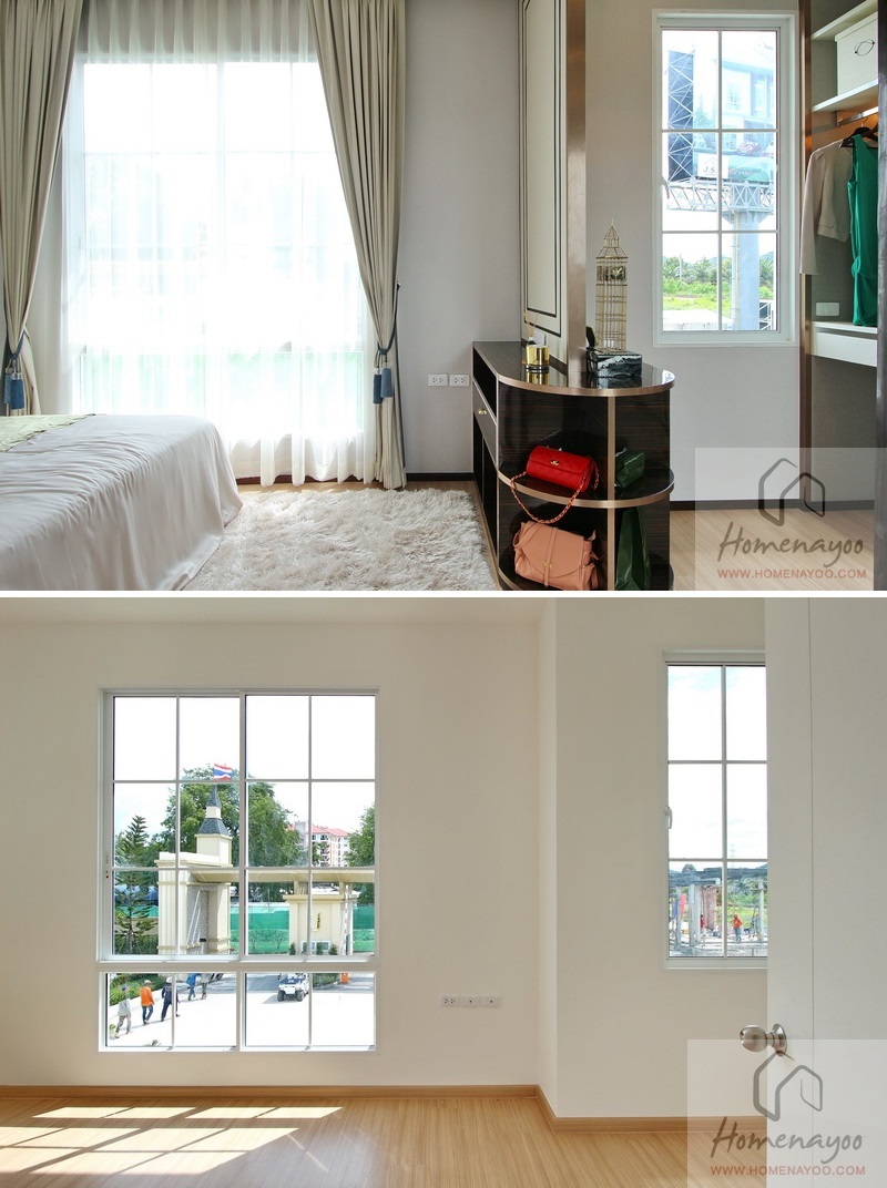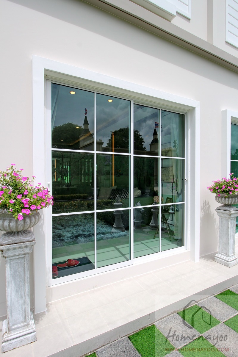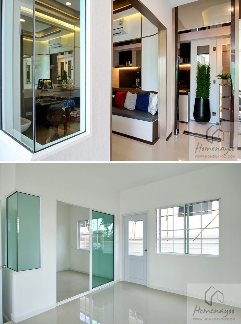 บ้านตัวอย่างทำทางเดินแบบเปิดโล่งให้ดูเป็นไอเดีย ส่วนบ้านมาตรฐานติดตั้งประตูกระจกเขียวตัดแสง แบบบานเลื่อน กรอบอลูมิเนียมสีขาว พร้อมหน้าต่างกระจกเข้ามุม ช่วยให้ห้องดูโปร่งโล่งขึ้น