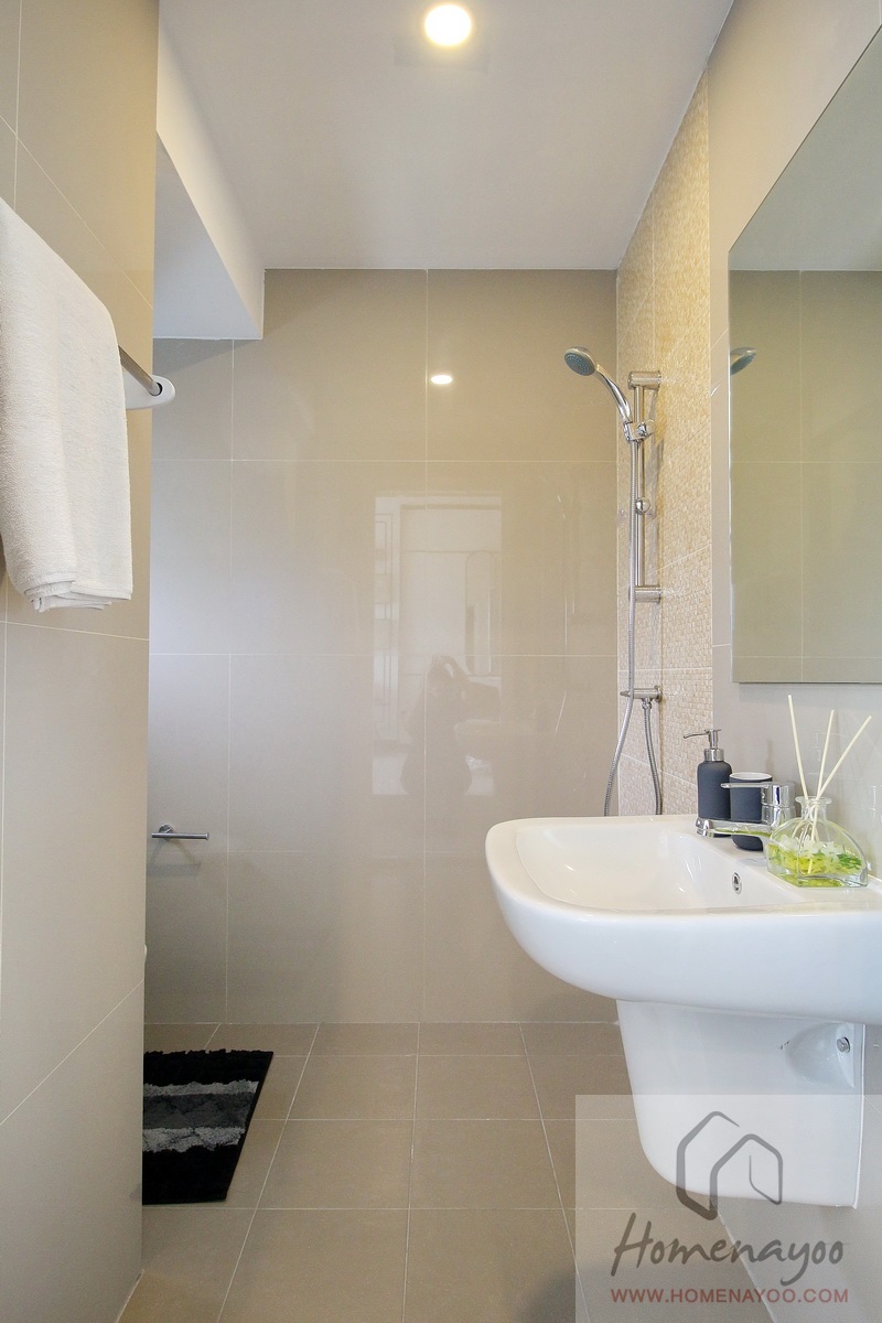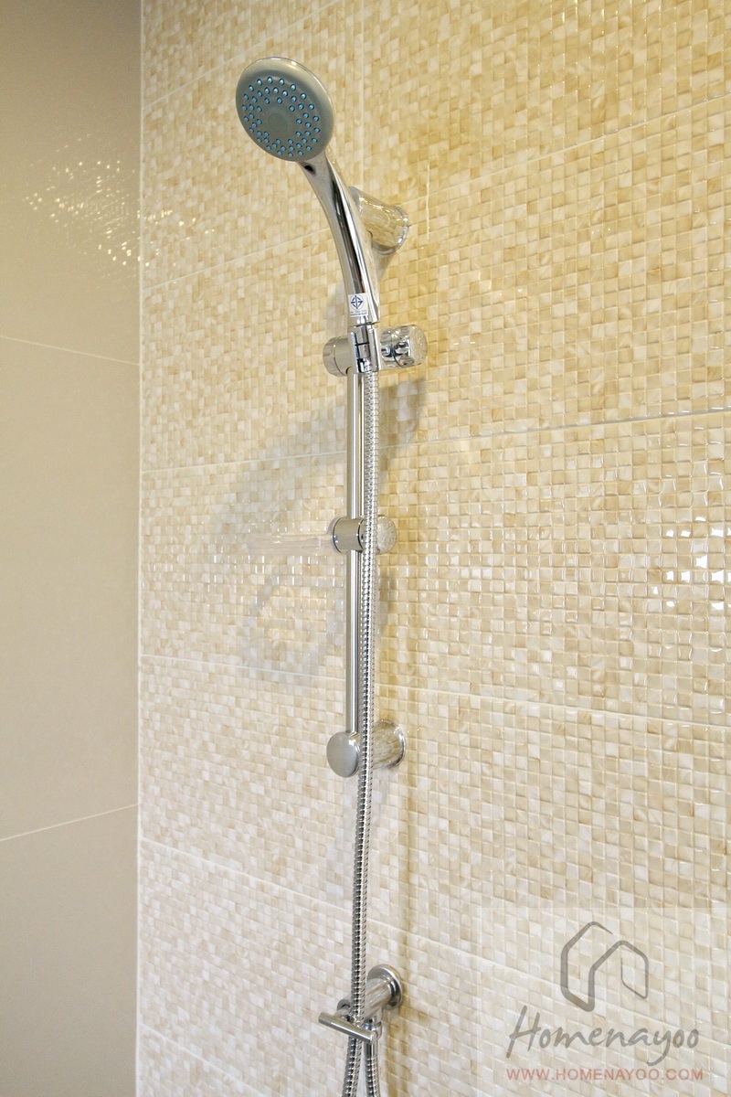 ถัดเข้าไปด้านในสุดเป็นส่วนอาบน้ำ ติดตั้งฝักบัว Hand Shower พร้อมราวปรับระดับสูง-ต่ำ และ ที่วางสบู่ ก๊อกน้ำโครเมียมก้านโยก ผนังด้านบนเดินงานระบบรองรับการติดตั้งเครื่องทำน้ำอุ่นให้พร้อมต่อใช้งาน