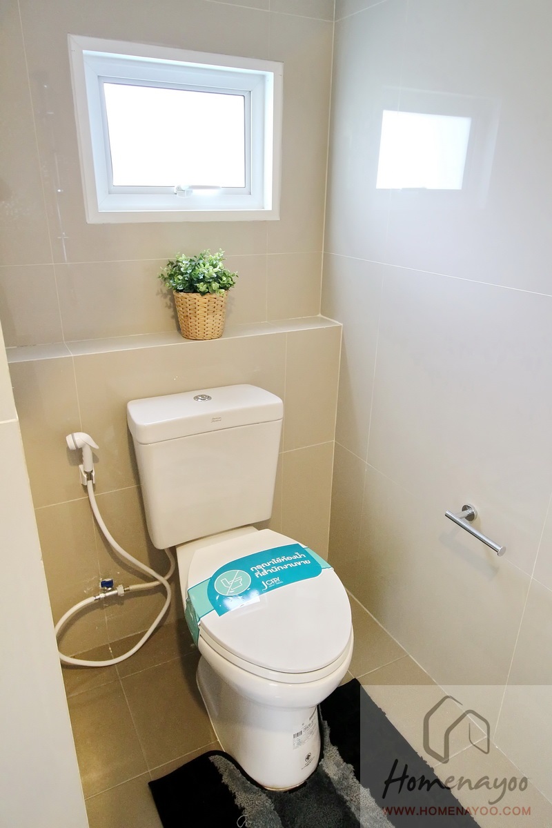 ตรงข้ามฝักบัวเว้นพื้นที่ลึกลงไป ติดตั้งโถสุขภัณฑ์แบบ 2 Piece ระบบ Dual Flush พร้อมสายฉีดชำระ และ ที่แขวนกระดาษทิชชู่ ด้านหลังก่อเคาน์เตอร์สำหรับวางของเอาไว้ให้ ผนังด้านบนมีหน้าต่างกระจกฝ้า แบบบานกระทุ้งให้ 1 บาน เปิดรับแสงธรรมชาติ พร้อมทั้งยังช่วยระบายอากาศ ระบายความชื้น ป้องกันการเกิดเชื้อราในห้องน้ำได้ด้วยค่ะ