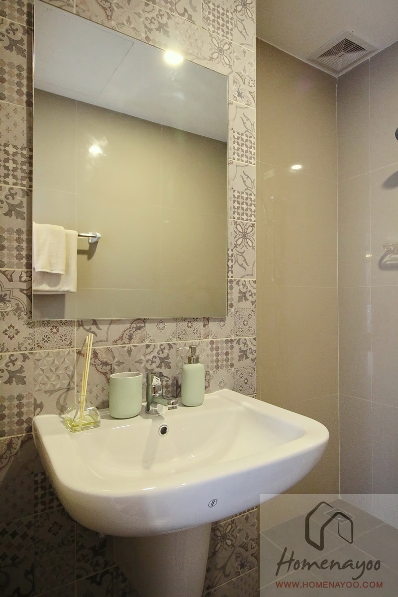 ซ้ายมือติดตั้งอ่างล้างหน้าเซรามิกแขวนผนัง ก๊อกน้ำโครเมียมก้านโยก ผนังติดกระจกส่องหน้าสี่เหลี่ยม 1 บาน