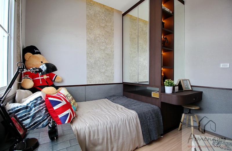 เริ่มจากห้องนอน 2 กันก่อน สำหรับห้องนี้ทางโครงการตกแต่งเป็นห้องนอนผู้ชาย โทนสีเข้ม วางเตียงนอน 3.5 ฟุต ให้ดูเป็นไอเดีย ห้องจริงสามารถเพิ่มขนาดเป็น 5 ฟุตได้สบาย ๆ นอกจากนั้นยังมีพื้นที่เหลือให้วางเฟอร์นิเจอร์มาตรฐานอื่นๆได้ครบชุด และผนังห้องนอน 2 สำหรับบ้านแปลงมุม จะมีหน้าต่างกระจกเขียวตัดแสง แบบบานเลื่อน ขนาด 1.5 x 1.2 เมตร ให้ 2 บาน (แปลงมาตรฐานมีให้ 1 บาน) เปิดรับแสงธรรมชาติ และลมธรรมชาติได้อย่างดีเลยค่ะ