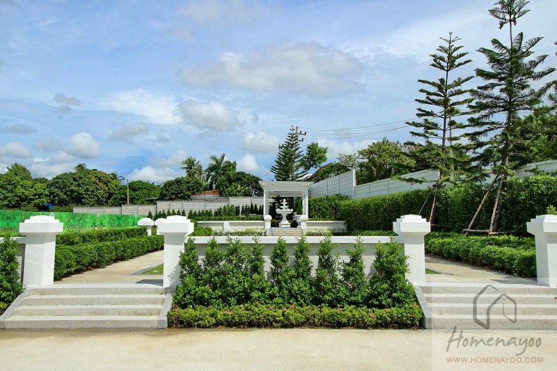ด้านหน้าสำนักงานขาย และ บ้านตัวอย่าง ตกแต่งสวนสไตล์อังกฤษ เอาไว้ต้อนรับผู้ที่มาเยี่ยมชมโครงการ
