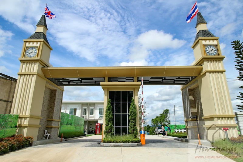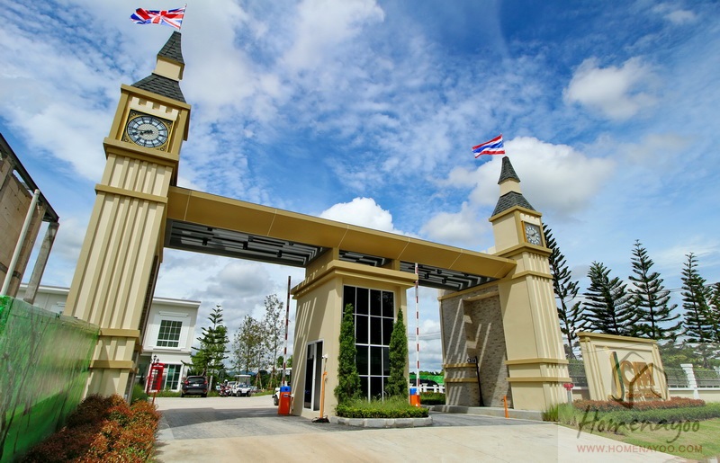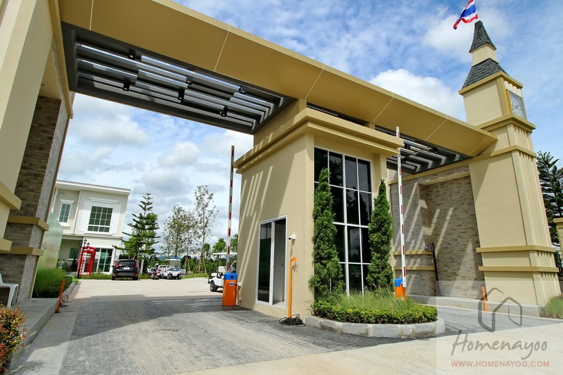 ตรงเข้ามาซ้ายมือจะเจอกับ Main Gate ขนาดใหญ่ ตกแต่งสไตล์อังกฤษ สถาปัตยกรรมตะวันตก เข้ากับคอนเซ็ปต์ของโครงการ ผนังซุ้มประตู, ป้อมรปภ. และ ป้ายชื่อโครงการโทนสีเหลือง ตัดบัว และเส้นสายสีเหลืองทอง ส่วนถนนเมนทางเข้า ปูพื้น Stamp Concrete เล่นลาย รับกับสวนสีเขียวด้านข้าง เข้ากับธรรมชาติอย่างลงตัว