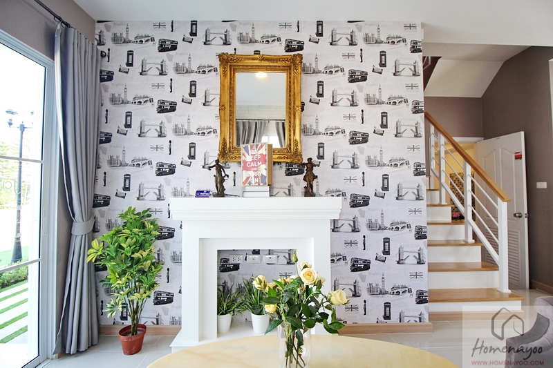 การออกแบบโครงการและวัสดุ – การออกแบบสำหรับภายนอกนั้นในเรื่องความสวยงามอาจขอข้ามนะคะ เพราะความชอบไม่เหมือนกัน การออกแบบของโครงการใช้แนวความคิดสไตล์อังกฤษ ตัวบ้านใช้โทนเรียบ เพิ่มมิติด้วยเฉดสีที่ต่างกัน พร้อมกับเส้นสายจากรอบวงกบหน้าต่าง ประตูที่เป็นสีขาว ตัวบ้านมีหน้าต่างและประตูกระจกหลายจุดทำให้มีแสงธรรมชาติเข้ามาในตัวบ้าน
