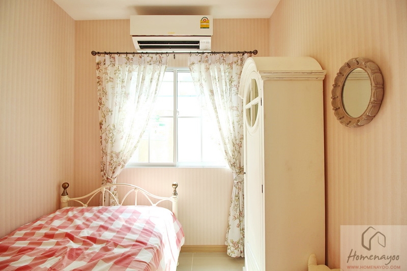 หัวเตียงด้านข้างวางโต๊ะหัวเตียงเล็กได้ หรือถ้าวางเตียง 3.5 ฟุตด้านข้างก็วางเป็นโต๊ะทำงานได้เลยค่ะ
